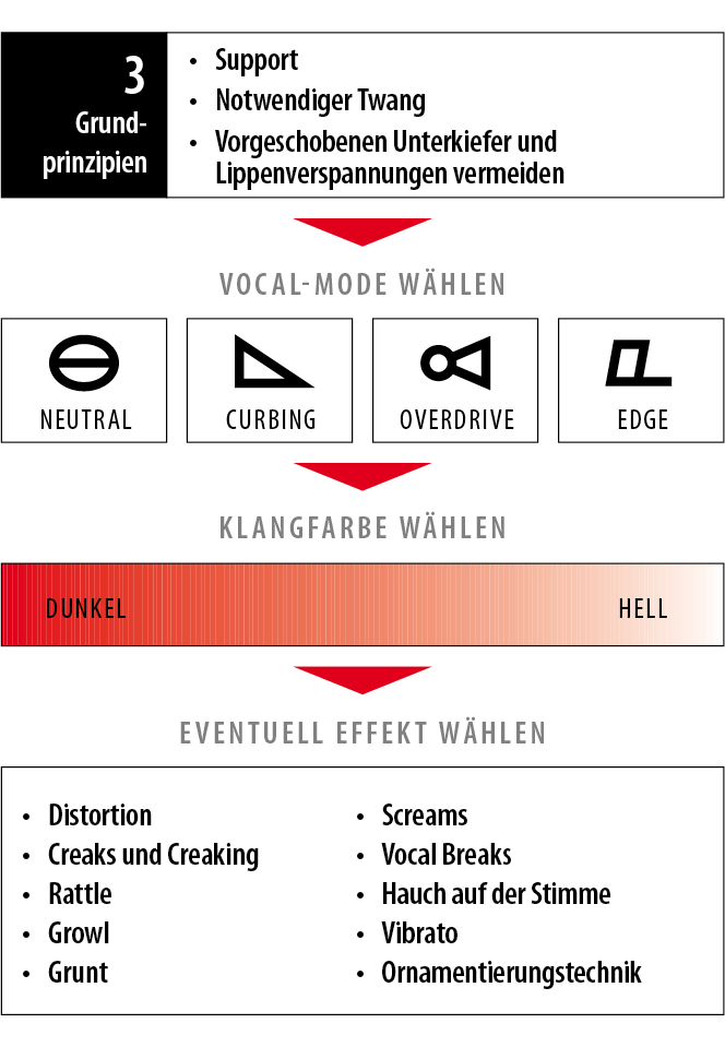 Der Einsatz der Stimme kann in vier Vocal-Modes eingeteilt werden: Neutral, Curbing, Overdrive und Edge (ehemals Belting). Die Modes unterscheiden sich durch ein unterschiedliches Maß an “Metall” im Klang. Die meisten Gesangsprobleme entstehen durch falsche Anwendung der Modes. Jeder Mode hat einen bestimmten Charakter, ebenso wie spezielle Einschränkungen und Vorteile. Um Fehler und technische Probleme zu vermeiden, ist es wichtig, die Modes zu kennen und zu beherrschen, ihre Vorteile zu nutzen und ihre Einschränkungen zu respektieren. Es ist ebenfalls wichtig, problemlos zwischen den Modes wechseln zu können, um ihre Vorteile optimal ausnutzen zu können. Man kann unauffällig wechseln oder abrupt, um bewusst Vocal Breaks (Brüche) beim Singen zu erzeugen. Jeder der vier Modes sollte separat und auf unterschiedliche Weise geübt werden. Denk daran, unabhängig vom Mode die drei Grundprinzipien einzuhalten.